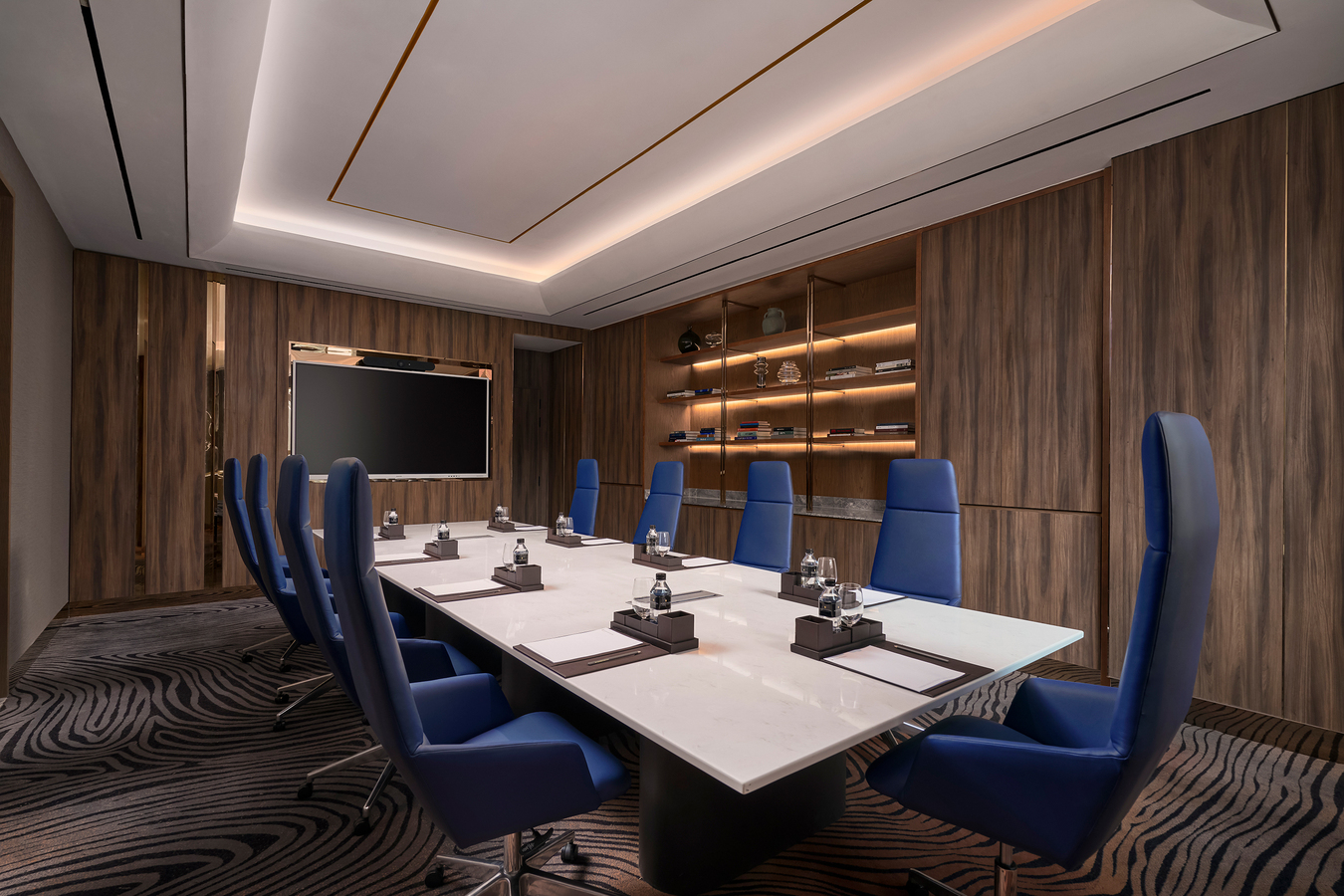 Setting the new benchmark for meetings in Ho Chi Minh City, our newly renovated meeting rooms have all been clad in beautiful timber with delicate metal detailing. All meeting rooms and board rooms are also designed with a multipurpose cabinet that is outfitted with a display area and storage on either sides. Double sliding doors with ribbed glass conceal the TV when not in use and showcase the display area. When guests want to use the TV, the doors slide to either sides and reveal an 85” interactive TV with video conference capabilities. These sliding doors may also be used for writing, replacing the need for additional flipcharts.