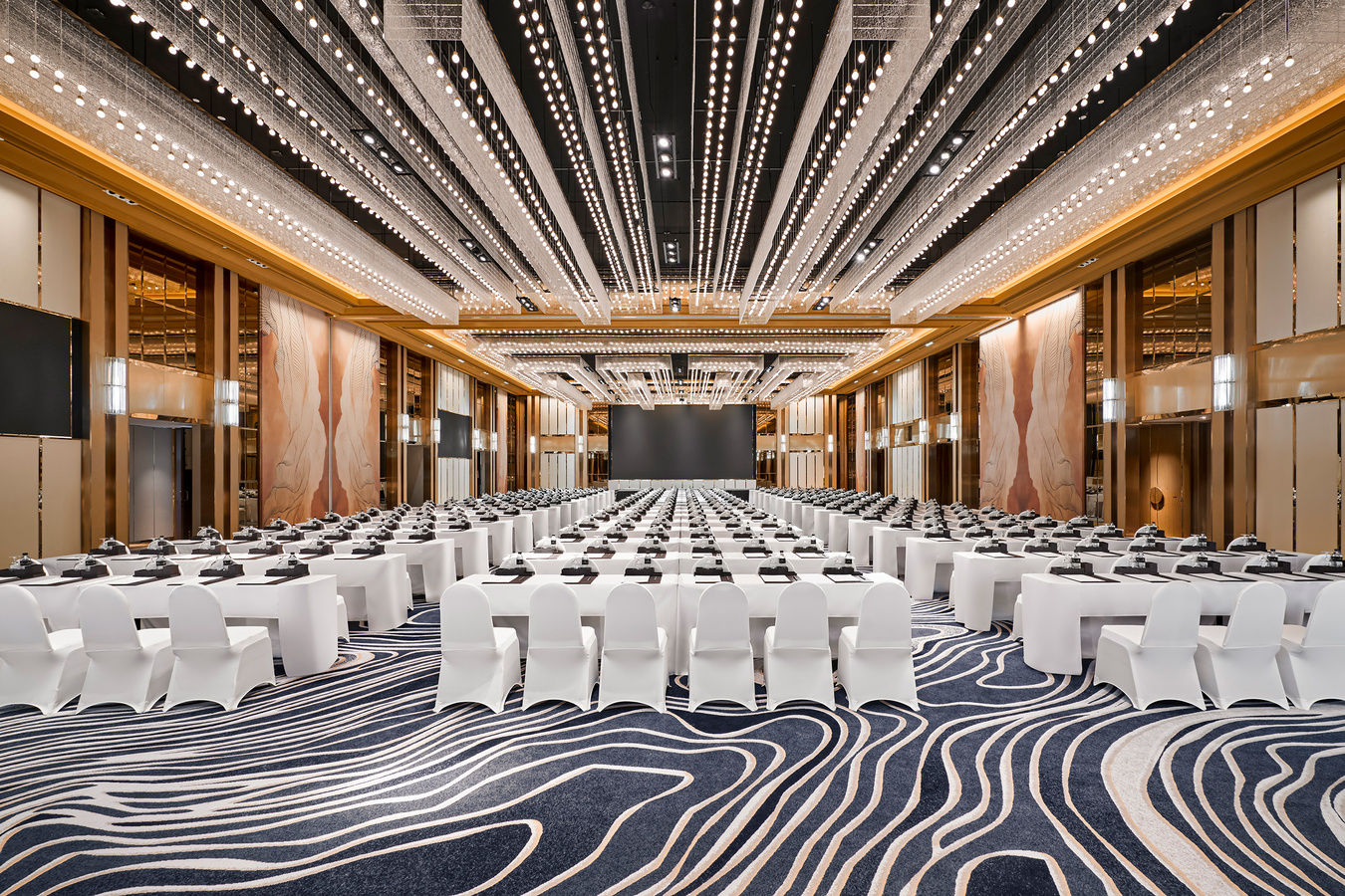 Upon entering the Pre-Function foyer, guests will be impressed by a curvilinear fabric ceiling feature that depicts the Mekong River. This feature ebbs and flows the entire length of the pre-function, giving softness and airiness to the space. The translucent fabric interplays with the specifically created lighting effects and offers a variety of programmable light hues and visual cues that will help further set the mood. The design of the carpet, in coastal hues of navy, beige and yellow – which resembles the water environment that the lotus lives in – covers the floor, while the decorative columns represent the intertwining of the lotus stems in the water as they reach the surface for sunlight.