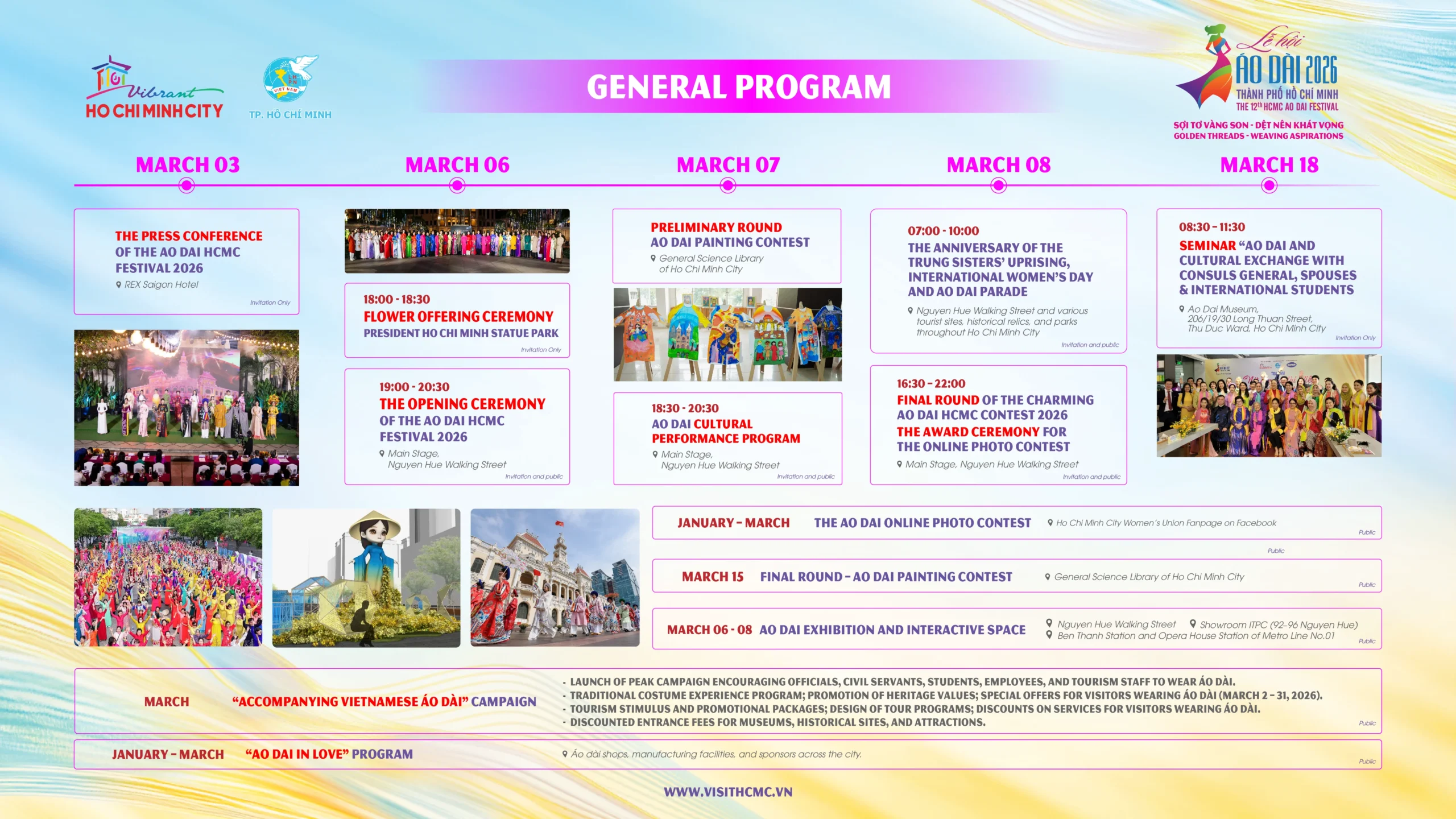 Ho Chi Minh City, March 01, 2026 – Toward the celebration of the 50th anniversary of Saigon – Gia Dinh officially being named after President Ho Chi Minh (July 02, 1976 – July 02, 2026), the 1986th anniversary of the Hai Ba Trung Uprising, and the 116th anniversary of International Women’s Day (March 8), the 12th Ho Chi Minh City Ao Dai Festival 2026—hosted by Ho Chi Minh City Department of Tourism and the Ho Chi Minh City Women’s Union, in coordination with relevant agencies—will take place under the theme “Golden Threads – Weaving Aspirations,” from March 01 through March 31, 2026 (peak days: March 06 – 08, 2026) at the President Ho Chi Minh Monument Park, Nguyen Hue Walking Street, the Export Showroom at 92 – 96 Nguyen Hue (Saigon Ward), Metro Line No. 1 stations, and across the network of historical-cultural sites, tourist attractions, hotels, and iconic landmarks throughout the new Ho Chi Minh City area.